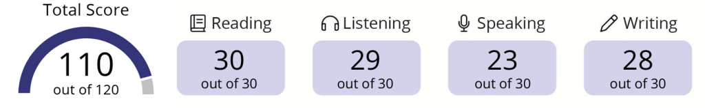$220를 또 내고 싶지는 않았기 때문에 한번만 트라이 해보고 토플성적에 맞는 학교를 가야겠다고 생각하고 시험을 봤고 110점이 나왔다. 스피킹에서 내딴에는 대답하기 까다로운 주제가 나와서 꽤 감점됐는데 그걸 제외하면 적당히 원하는 점수가 나왔다,,,만 이게 나중에 학교 선택에 제약을 걸기는 했다. 스피킹 개못봤네진짜 저때 뭔생각이었냐